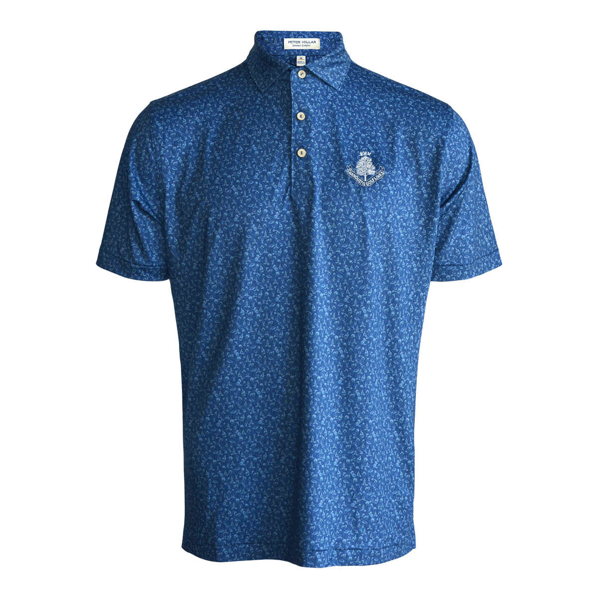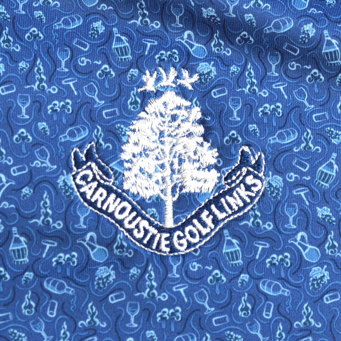 Our men's Peter Millar pattern polo shirt in sport navy features our Carnoustie Golf Links logo on the left chest. This classic fit performance polo is made from a soft jersey fabric that features moisture wicking, UPF 50+ protection, odor resistance and easy care with four way stretch for optimal mobility on and off the course. Made from 92% polyester and 8% spandex.
