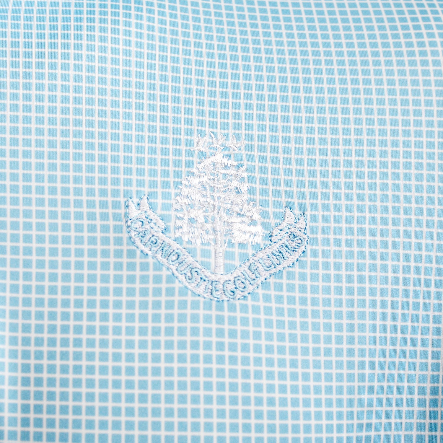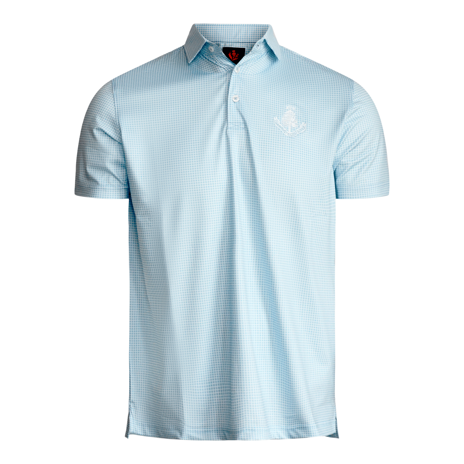 Our Donald Ross Sport pattern performance polo in neptune features our Carnoustie Golf Links logo on the left chest. This performance polo offers UPF50 sun pertection Made from 91% polyester and 9% spandex