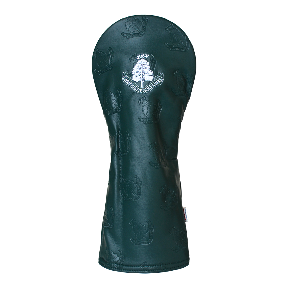 Our AM&E driver head cover in forest green, features our Carnoustie Golf Links logo embroidered on the front and has a subtle stamped design showing our logo across the cover. This head cover can be matched with our driver, fairway, hybrid and putter head covers.