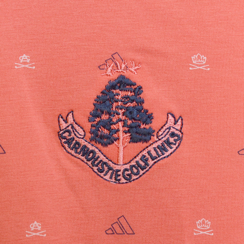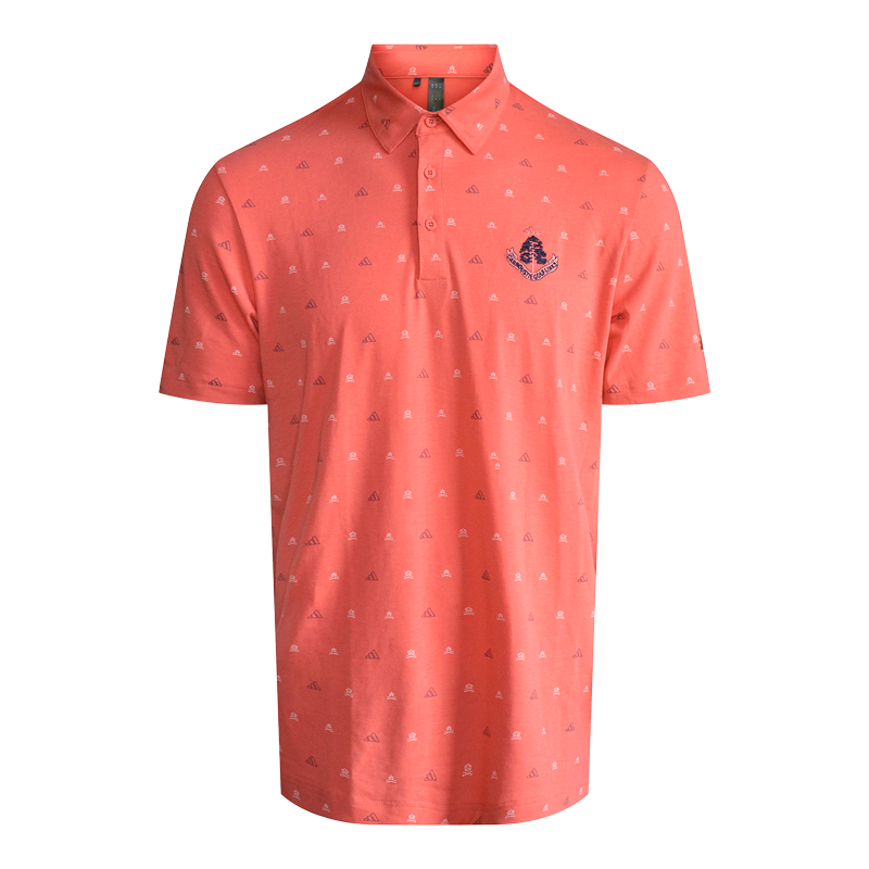 Our men's Adidas pattern polo shirt in red features our Carnoustie Golf Links logo on the left chest. This polo shirt has a soft cotton feel with plenty of stretch to let you swing and flex without restriction. AEROREADY wicks moisture to keep you dry throughout your round. Made from 74% recycled polyester, 19% cotton,