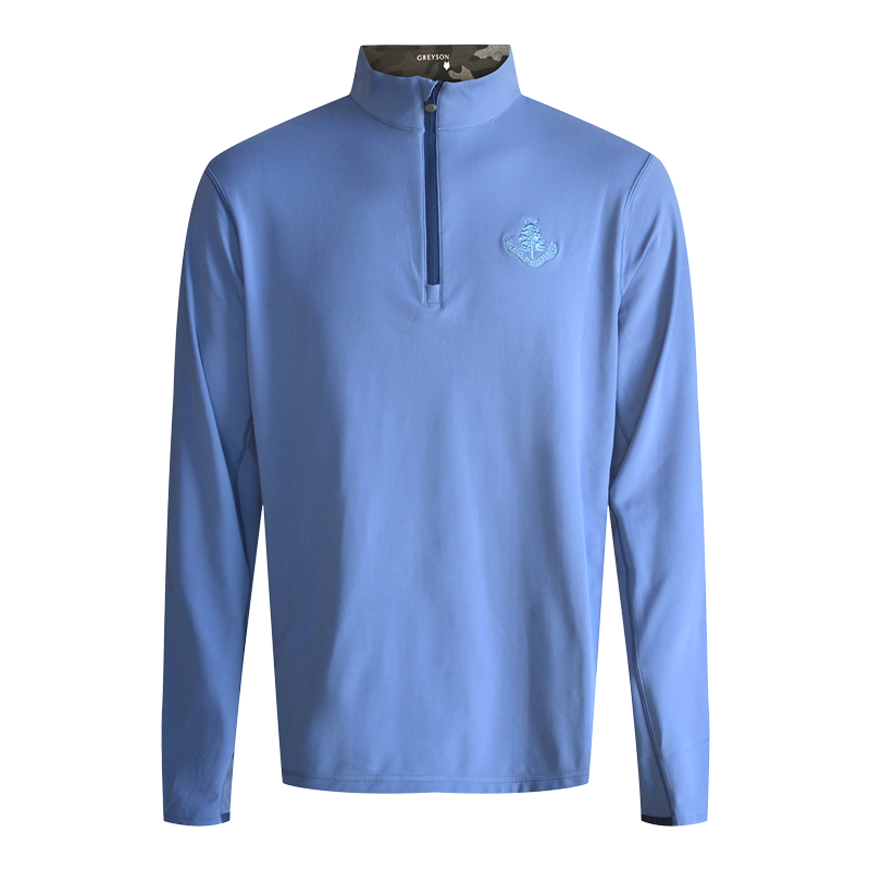 Our men's Greyson quarter zip sweater in blue features our Carnoustie Golf Links logo on the left chest. This quarter zip is constructed with the finest technical yarn sourced from Italy. The blended nylon and elastane brushback knit fabric was developed with function and a luxury feel, it is also slightly elongated to increase functionality. Made from 80% polyamide and 20% elastane.