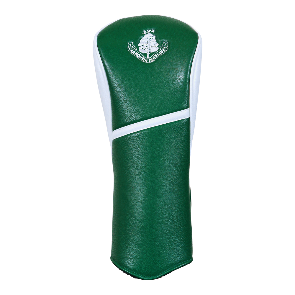Our AK Golf driver head cover in green & white features our Carnoustie Golf Links logo. This can be matched with the fairway & putter covers. Made with synthetic leather material.