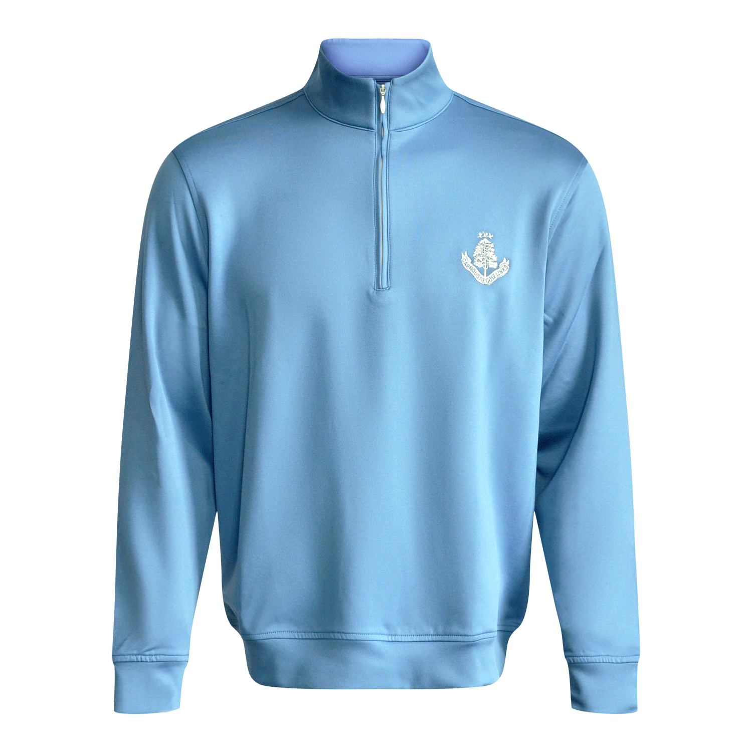 Our Donald Ross Classic plain 1/4 zip in denim features our Carnoustie Golf Links logo on the left chest.This 1/4 zip has a front welted zipper and self banded cuffs and waistband. Made from 96% polyester and 4% spandex