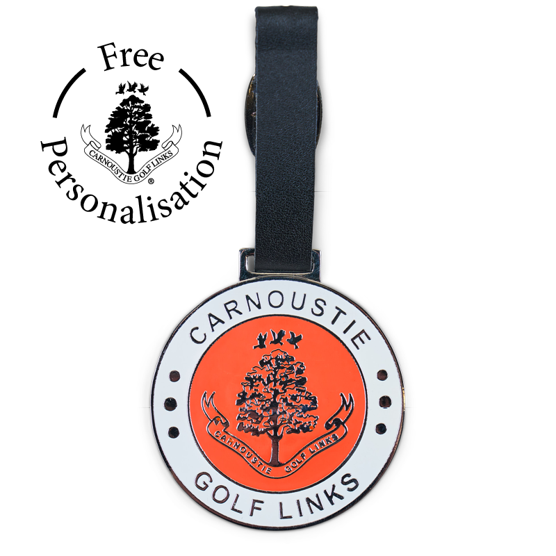 Our AK Golf bag tag with an enamel orange front features our Carnoustie Golf Links logo and text.