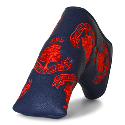 Our AK Golf blade putter head cover in navy & red features our Carnoustie Golf Links logo in a repeat scatter design across the cover. Made with synthetic leather material and includes a magnet snap closure.