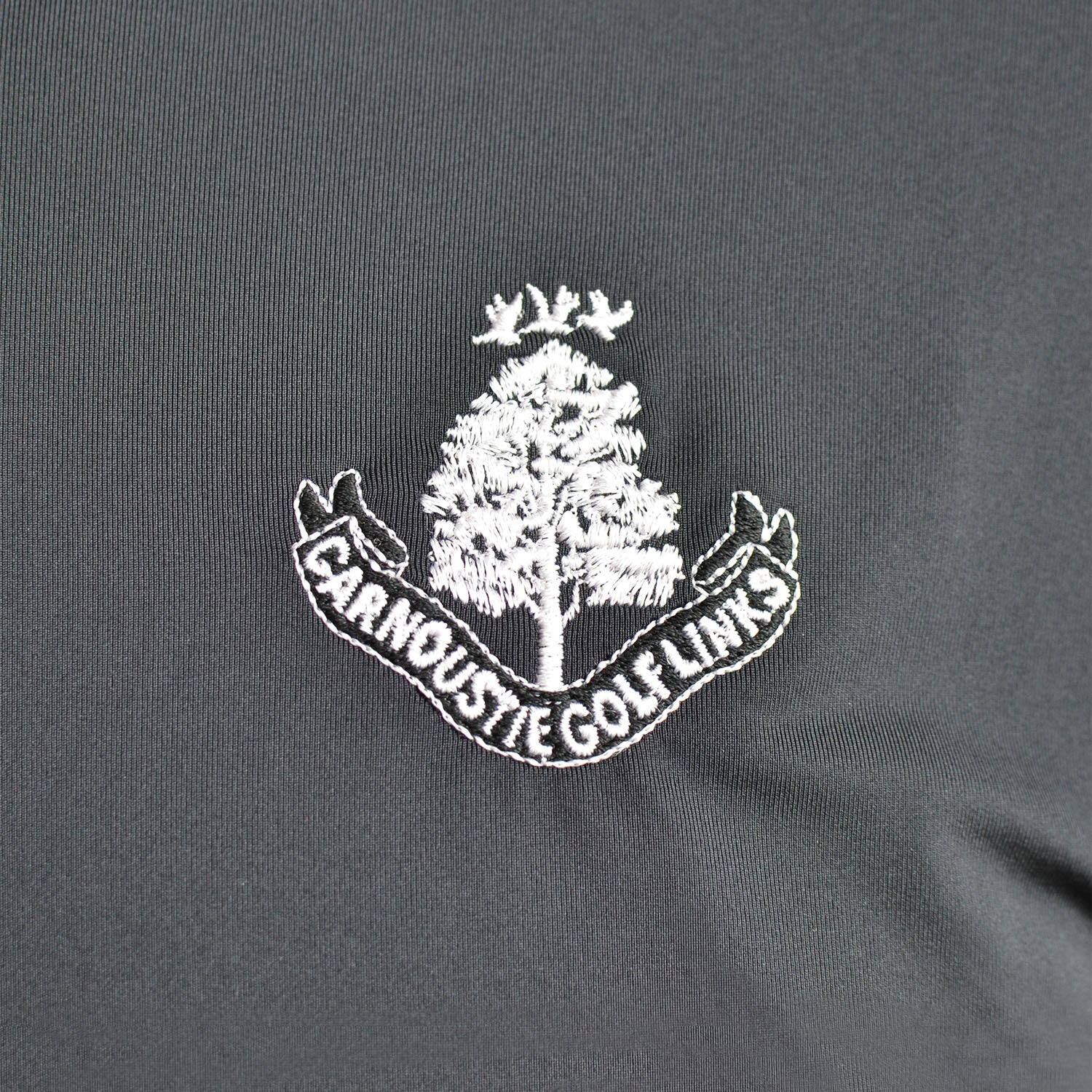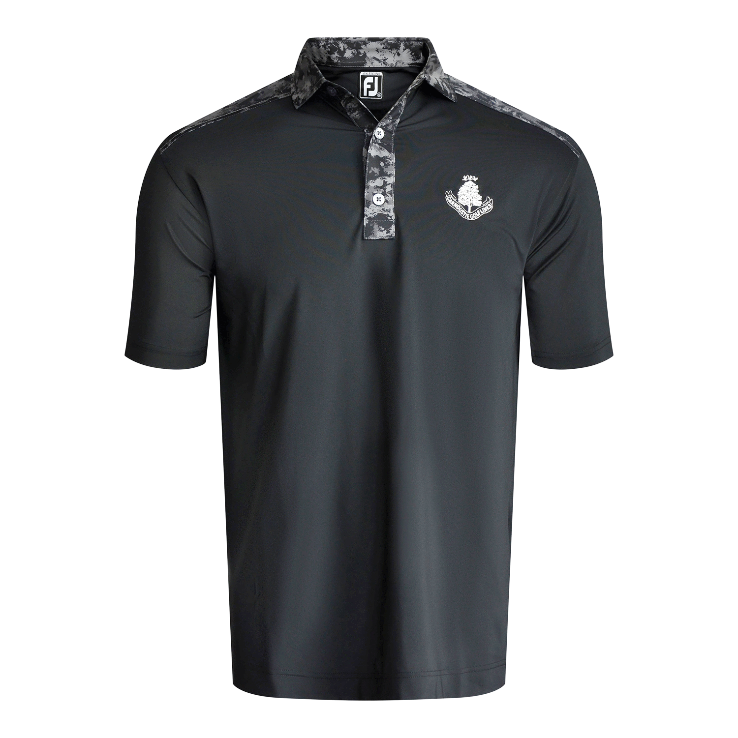 Our men's Footjoy plain polo shirt in black features a cloud camo trim collar and shoulder as well as our Carnoustie Golf Links logo on the left chest. This performance polo is made from ProDry fabric that features moisture wicking, UV protection and easy care keeping you cool on and off the course. Made from 88% polyester and 12% spandex.