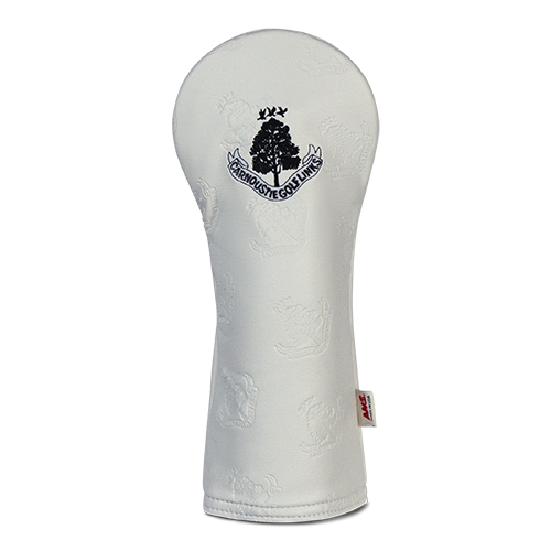 Our AM&E fairway head cover in white, features our Carnoustie Golf Links logo embroidered on the front and has a subtle stamped design showing our logo across the cover. This head cover can be matched with our driver, hybrid and putter head covers.