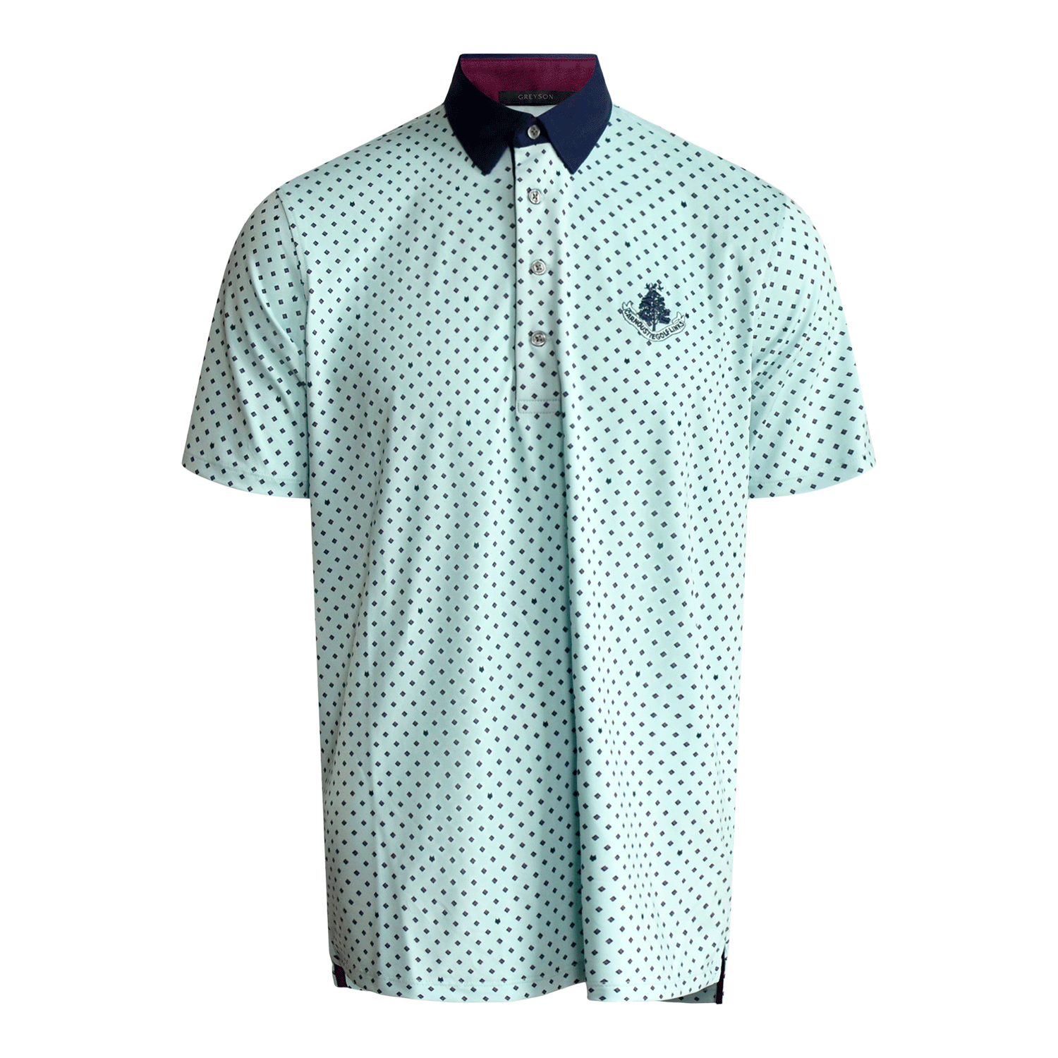 Our men's Greyson pattern polo shirt in topaz features our Carnoustie Golf Links logo on the left chest. This pattern polo is made from a blend of polyester and spandex fabric with a sateen wash creating a silky hand. Made from 90% polyester and 10% spandex