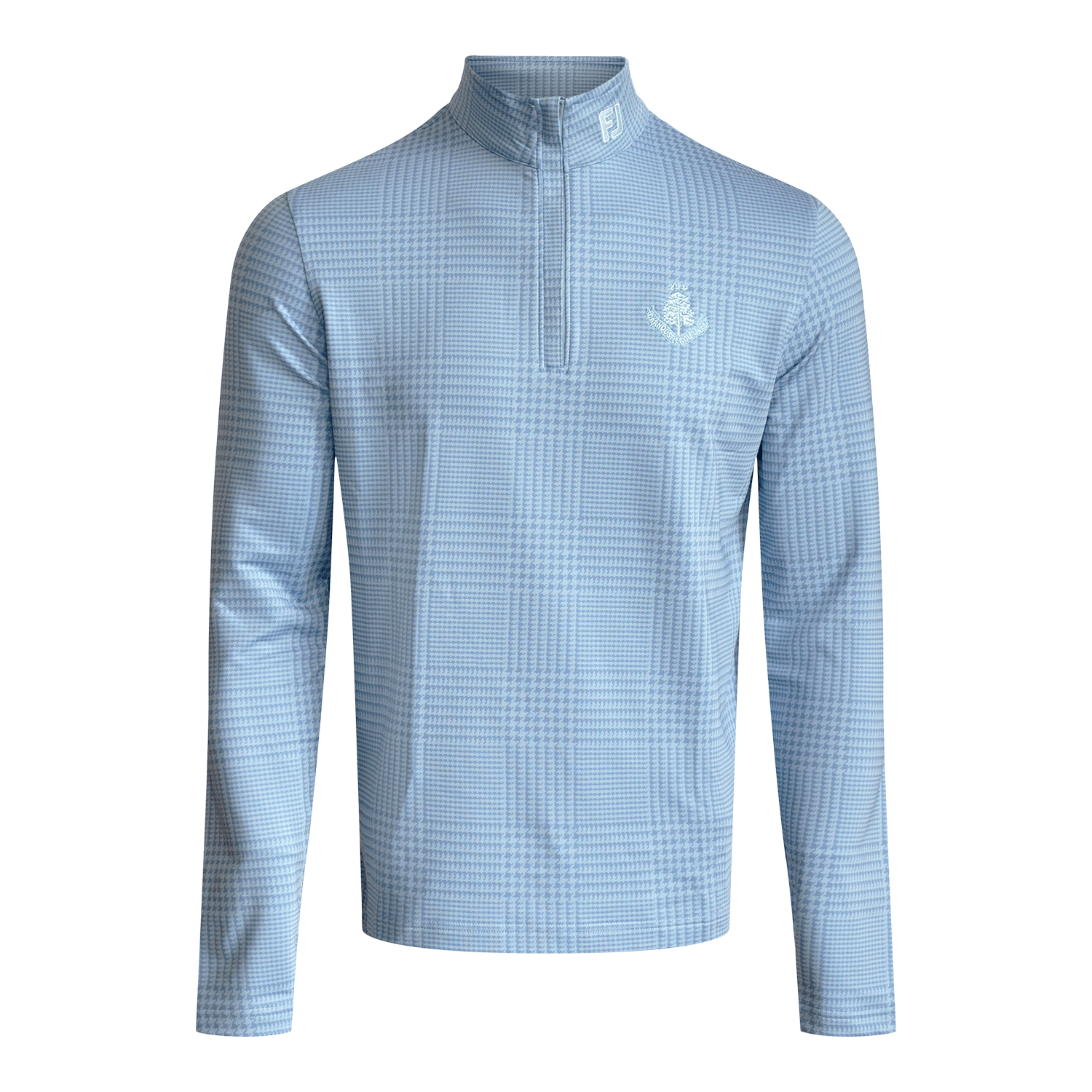 Our men's Footjoy glen plaid chill out 1/4 zip sweater in storm features our Carnoustie Golf Links logo on the left chest. This1/4 zip sweater is light weight keeping you cool on and off the course. Made from 83% polyester & 17% spandex.