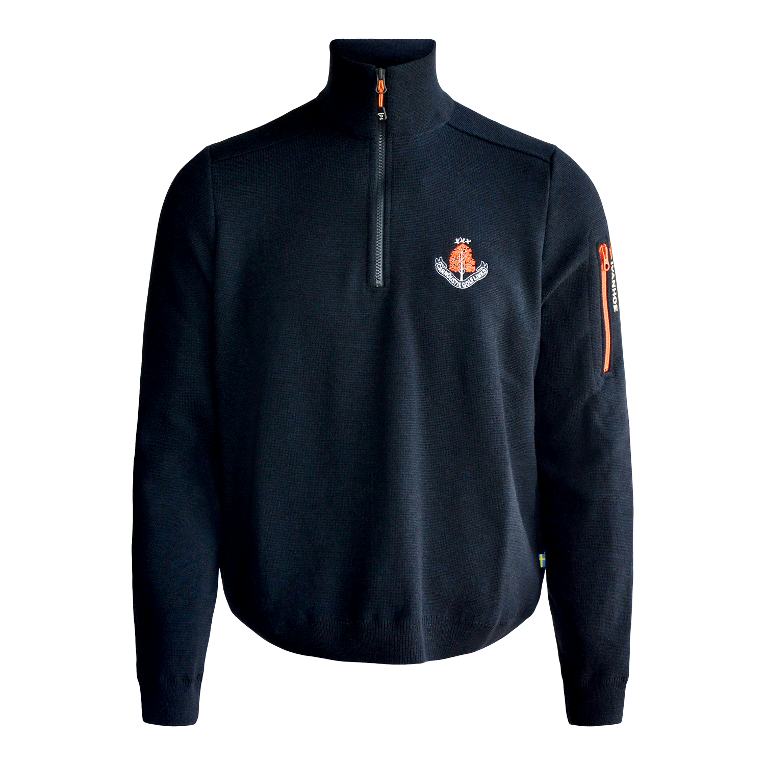 Our men's Ivanhoe half zip windbreaker jacket in navy features our Carnoustie Golf Links logo on the left chest in red. This jacket features red detailing, drawstring at body bottom and the inner lining provides exceptional warmth, wind resistance and is breathable against the skin. It is made from 100% Merino wool and is extremely soft to touch.
