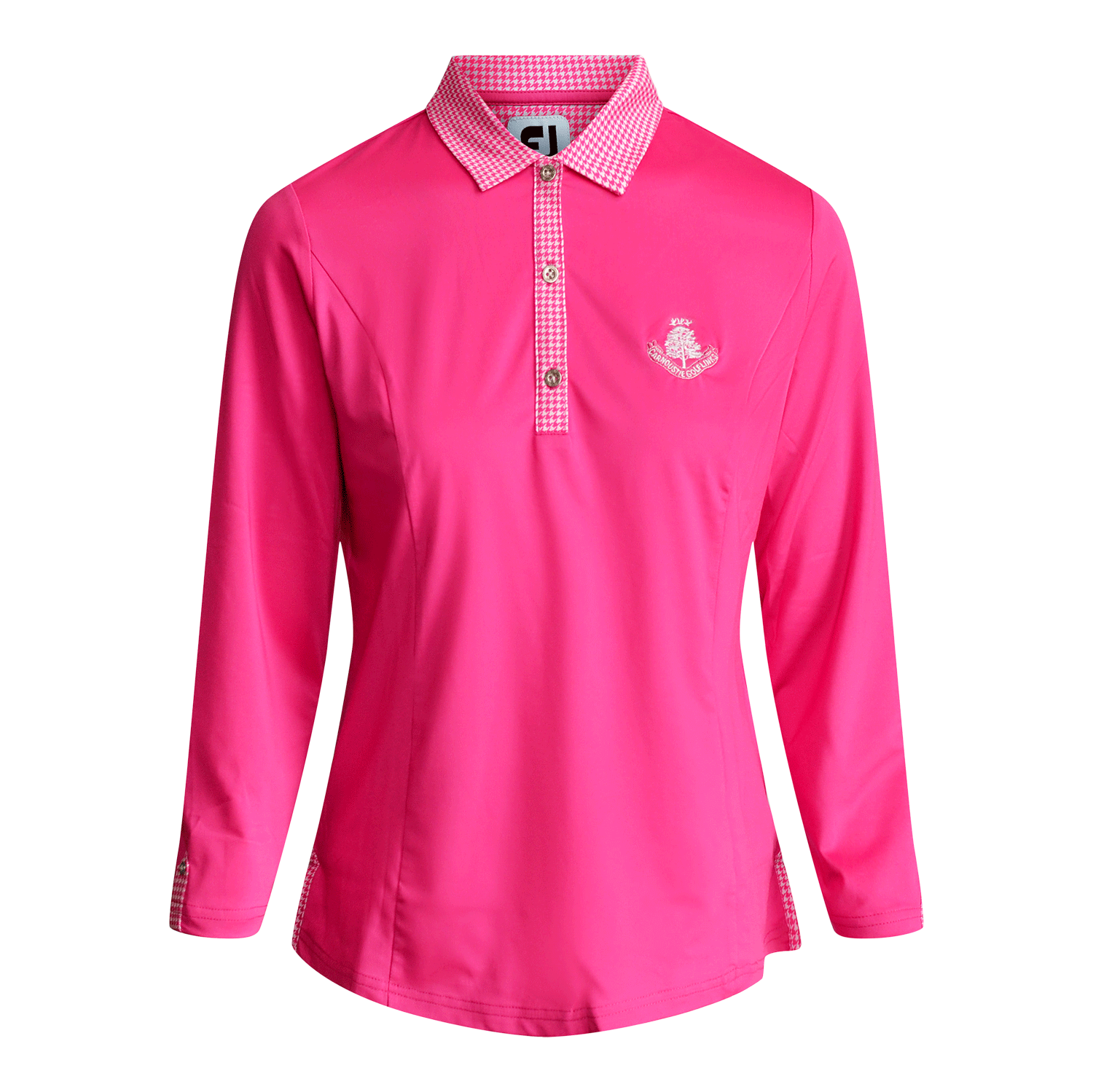 Our women's Footjoy plain polo shirt in hot pink features a houndstooth trim collar and our Carnoustie Golf Links logo on the left chest. This performance polo is made from ProDry fabric that features moisture wicking, UV protection and easy care keeping you cool on and off the course. Made from 88% polyester and 12% spandex.