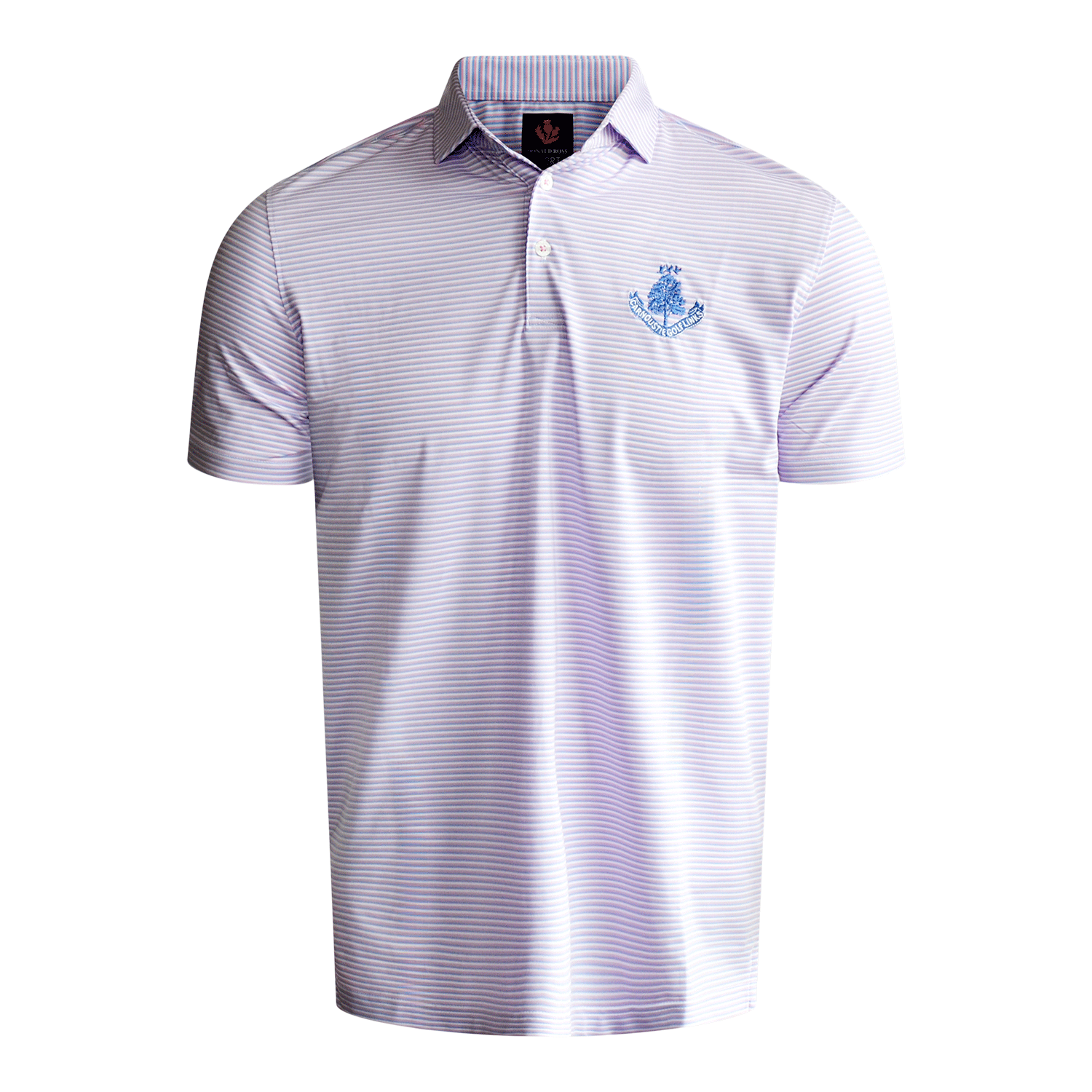 Our men's Donald Ross sport fit stripe polo shirt in pink multi features our Carnoustie Golf Links logo on the left chest. This polo is a slightly trimmer fit and the material is a performance pique. It is also extremely breathable, moisture wicking and lightweight. Made from 91% polyester and 9% spandex.