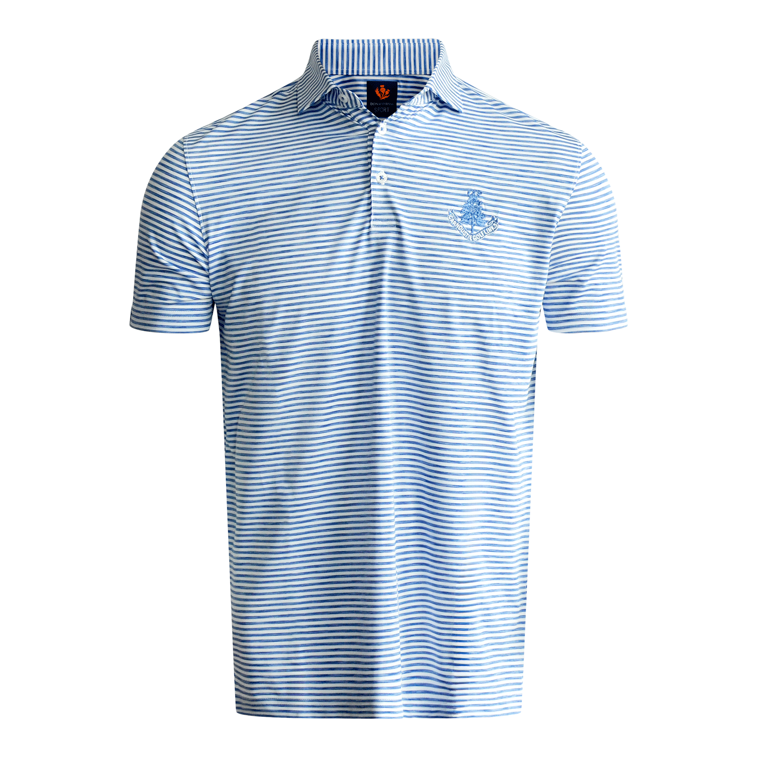 Our men's Donald Ross sport fit stripe polo shirt in ultra marine and white features our Carnoustie Golf Links logo on the left chest. This polo is a slightly trimmer fit and the material is a performance pique. It is also extremely breathable, moisture wicking and lightweight. Made from 91% polyester and 9% spandex.