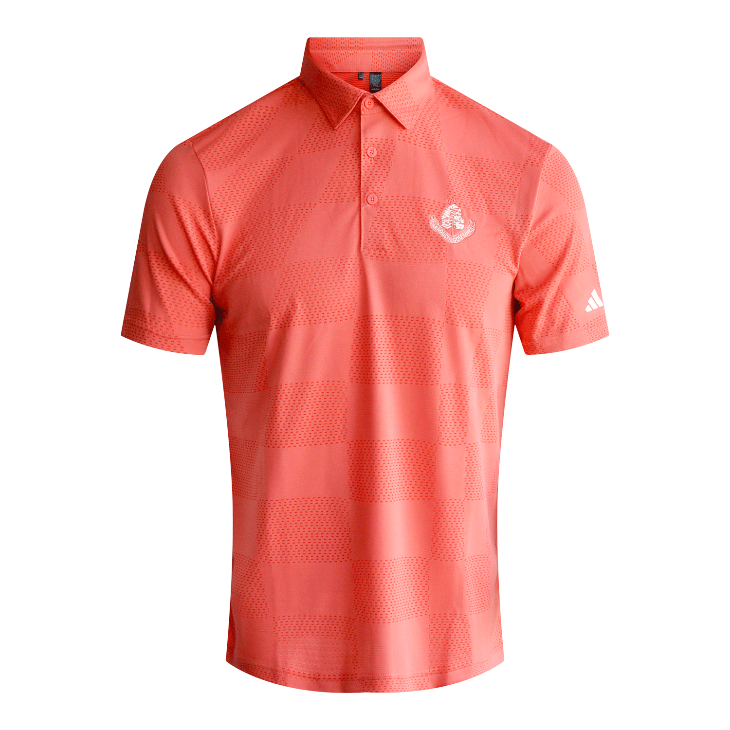 Our men's adidas ultimate365 textured polo in preloved scarlet features our Carnoustie Golf Links logo on the left chest. This polo is a regular fit, 3 button polo made from 100% recycled polyester