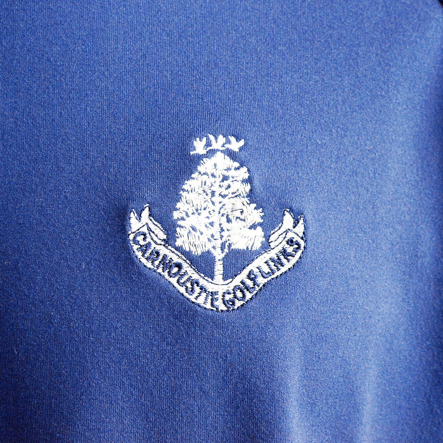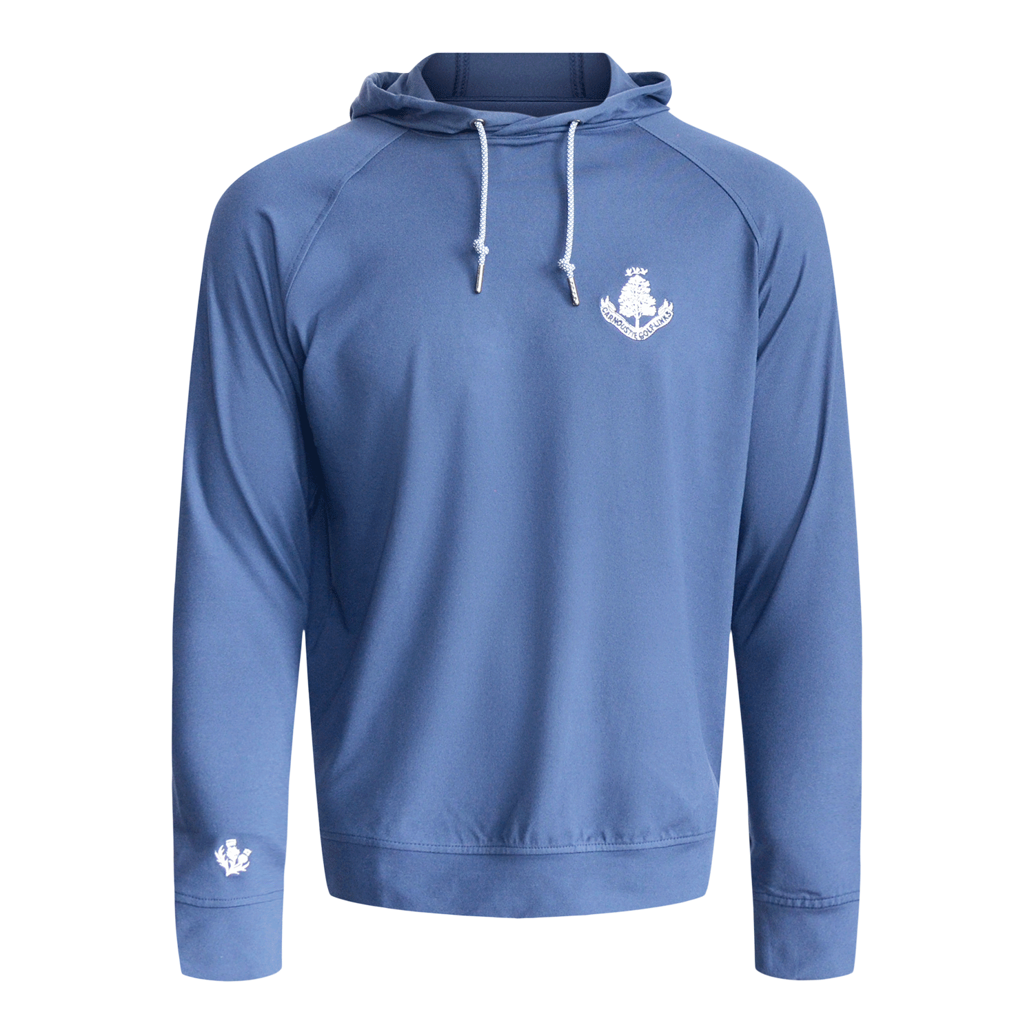Our Donald Ross Tyler hoodie in navy features our Carnoustie Golf Links logo on the left chest. This hoodie includes a kangaroo pocket with self banded cuffs and waistband. Made from 94% polyester and 6% spandex