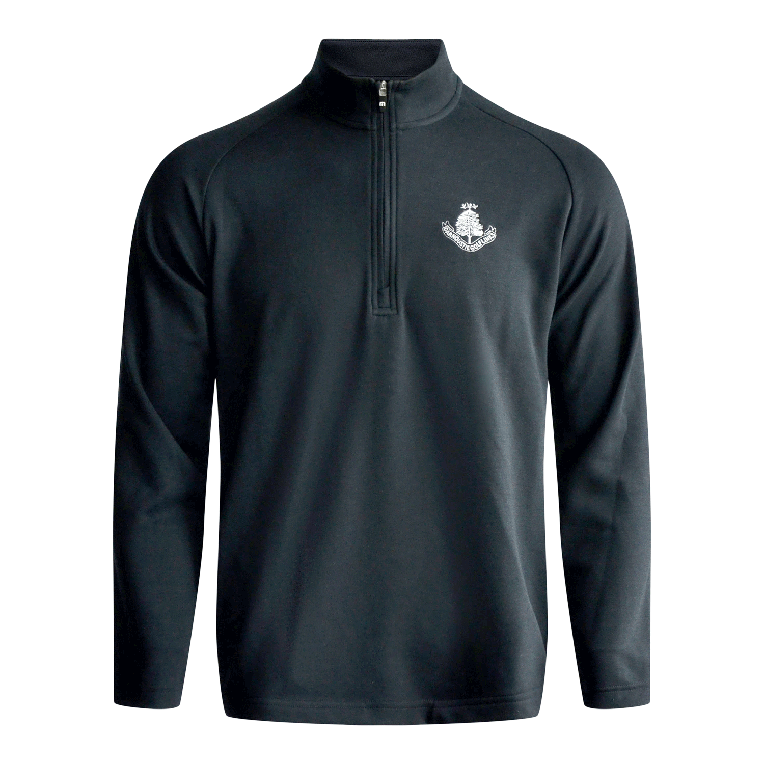Our TravisMathew upgraded 1/4 zip sweater in black features our Carnoustie Golf Links logo on the left chest. This 1/4 zip sweater is midweight with side entry pockets. Made from 72% polyester and 28% cotton
