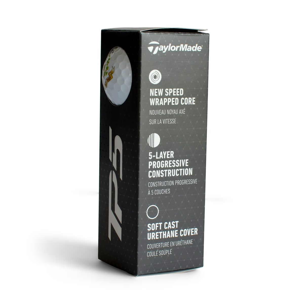 Our Taylormade TP5 white golf ball features our Carnoustie Golf Links logo on the side of every ball. These golf balls are packaged in sleeves of 3.