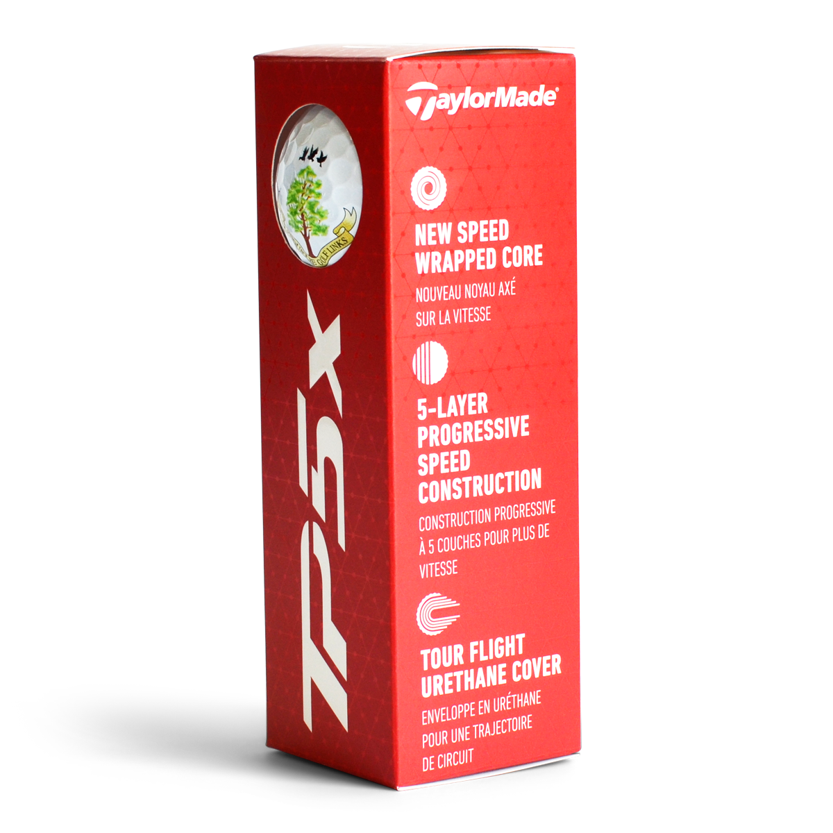 Our Taylormade TP5x white golf ball features our Carnoustie Golf Links logo on the side of every ball. These golf balls are packaged in sleeves of 3.